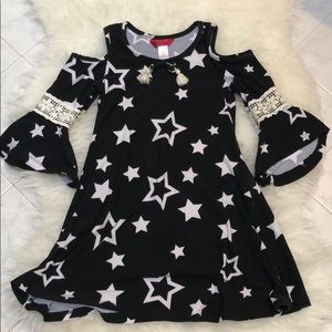 Cold shoulder, bell sleeve, star print dress. Pre loved amd only worn by my little one. In great condition. Super soft & stretch fabric. I have many other stylish item’s in the same size.