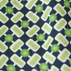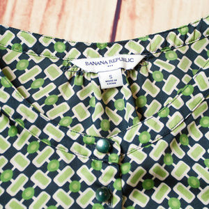 Beautiful geometric print blouse in shades of green. Size small. I wish it fit me -- a larger chest than mine would fill it out better (I'm just an A). 6 buttons above waistline; tie in back. 100% polyester. The only flaw is 2 thin lines on the back -- see photo 8. I didn't even notice when I bought it. I barely noticed it later after a very close inspection. This is a very close-up photo. Please see photos for measurements. 3 photos are courtesy of the previous owner, with permission. :)