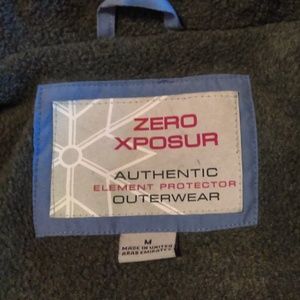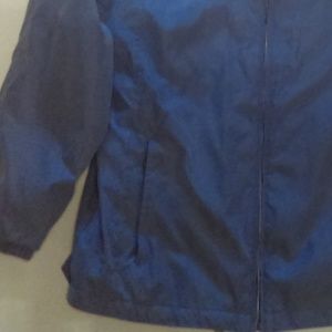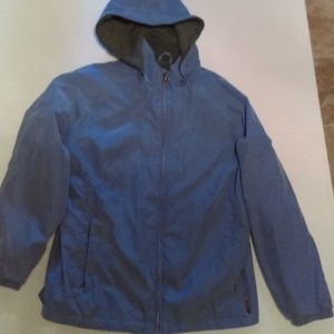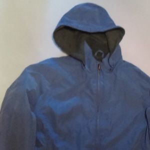 In good pre-owned condition. Very nice & soft outer lavender jacket. Element protection (per label). Inside fleece is gray. 2 front zippered pockets. Left shoulder pocket. Removable zippered hood. Made of: polyester, nylon, polyurethane coating, rayon. Machine washable. Measurements: front armpit to armpit 23" front top of zippered neck neck to bottom hem 27" Back (under hood to bottom of hem) 27". all around bottom hem 47".