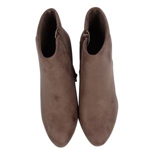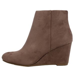Light Cement faux suede almond shape toe with 3 inch wedge. Since it is almond shape toe, it would be best to order half size bigger. Model is usually a size 7, and a size 7.5 fits her perfectly.