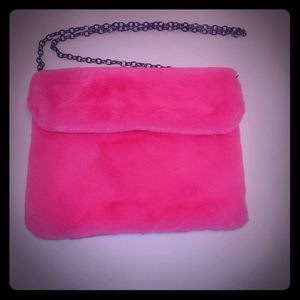 Bright pink NWOT soft bag with a removable crossbody silver tone chain strap. One internal slip pocket. Please see photos. The inside has a lining that is slightly smaller than the outer dimensions of the bag. Snap button closure.