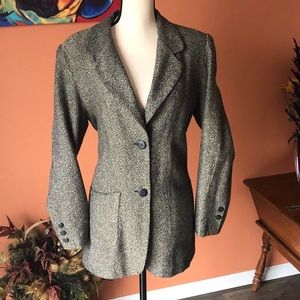 Single breasted with light shoulder pads, one breast pocket, dual lower pockets. Mini variegated pattern gives it an interesting “pebbled” pattern and makes it versatile to wear with many colors. About 30” in length, with sleeves around 23” long and measures about 20” pit to pit. Shell is 100% acrylic, lining is 100% nylon. 2 button front enclosure, one sleeve has 3 buttons and the other has 2 but not noticeable and are only decorative. Otherwise in great with no rips or discoloration.