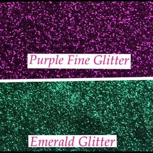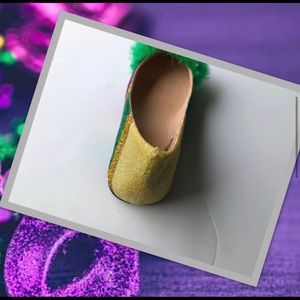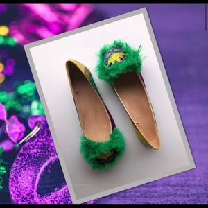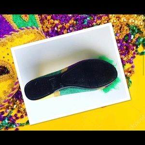 Get these women's purple, green, yellow, & gold glittered ballet flats w/Mardi Gras glitter glasses symbol on the front surrounded in soft green feathers, & black painted glittered bottoms.