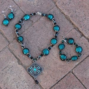 This is a one of a kind piece of jewelry commissioned for my online store. This gorgeous necklace, earrings, and bracelet were hand made in Germany. The necklace also features a beautiful metal pendant with a center stone and accented with rhinestones. The necklace is 10", the bracelet is 8".
