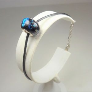 NAUTICAL SILVER TONE BEACH SURFERS BLACK MYSTIC RAINBOW BEAD BLACK LEATHER CORD BRACELET