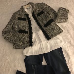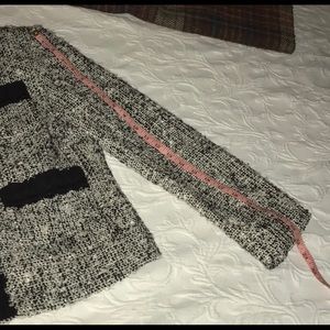 Favorite jacket style, so “Chanel-esque! Nice weight marled wool blend is perfect for fall, winter, and into spring. An absolutely easy “dress up/dress down” jacket, as it’s great with a velvet pencil skirt or favorite jeans! Wish I hadn’t outgrown this one! Measurements in photos.