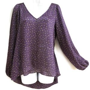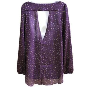 BCBGeneration Blouse V Neckline. Triangle Back Cutout. Shiny Purple with Yellow Splat Dots. Hi Low Curved Hemline. Nylon/Poly Blend. Tagged Size S.