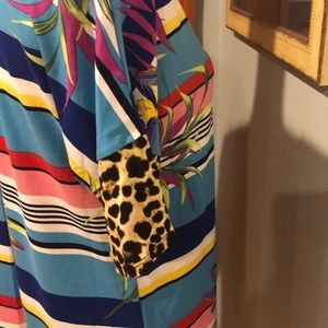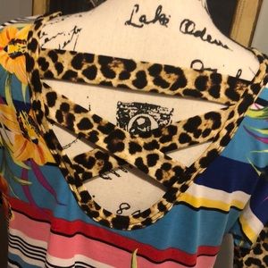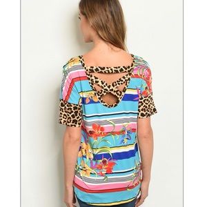 Super soft striped tee with floral detail and leopard print cuffs and back criss-cross detail. The ultimate in pattern mixing which is totally in right now!! Long in length. Pair with leggings or jeans - either way you'll be right on trend!!