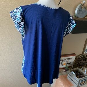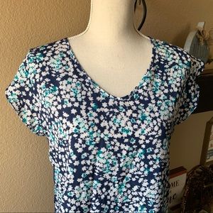 Ann Taylor Navy Blue ShortSleeve Floral Blouse L. Beautiful Top Polyester and Rayon. In excellent condition. 26 inches in length and 19 inches across at the armpits. From a smoke free home however I do have pets. P3