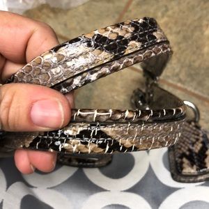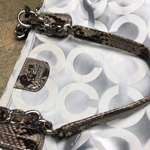 Beautiful coach bag with snakeskin print handles. Previously loved still has a lot of life left in it. Some very small cracking in the straps.