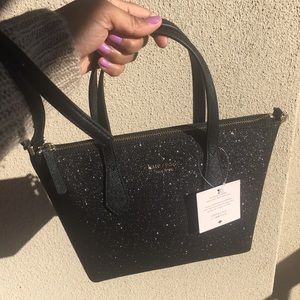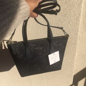 Small Kate Spade black glittery satchel. Separate crossbody strap. Leather straps.