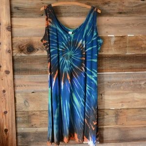 New with Tags Colorful and beautiful Our House Tie Dye, Tie back mini dress. The perfect pop of color for your hippie, bohemian chic style. This Gorgeous mini dress is a mix of Blues with pop of orange and white. Loose fit with a tie back, allowing you to adjust how it flows off your body. Tank, T shirt style dress perfect for layering with leggins, even a long sleeved shirt underneath for cooler weather. In excellent condition, Womens size M.