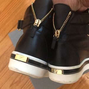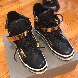 Nice! Black and gold Giuseppe Zanotti high top leather shoes with gold zipper on each size gold plate across the top. Minor scuffs at sole great condition! Size 43.5 Us size 10 1/2