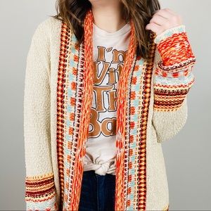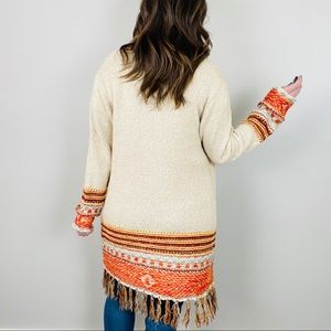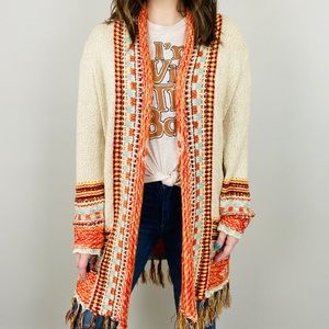 Long knit duster cardigan sweater. Open front. Shawl collar. Woven Aztec tribal design. Fringe tassel trim. A great layering piece. By Fate.