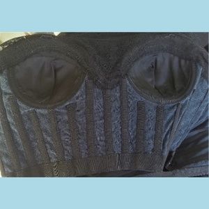 It has a built in corset top with built in lightly padded cups and boning. It faatens with a rear zipper, has very delicate lace at the hem and top. It's a beautiful dress.