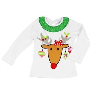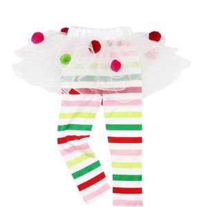 Boutique item. NEW in original packaging. Adorable baby girl and little girl winter outfit. Long sleeve shirt with button at back, ribbon around neck and reindeer on chest. knit legging with stripes, tutu with 3 layers and Pom poms attached. This would be perfect for a Christmas holiday gift or to wear for a special occasion or dress up.
