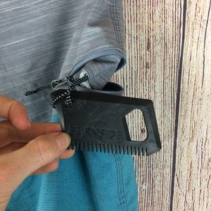 Features pocket comb and tie waist.
