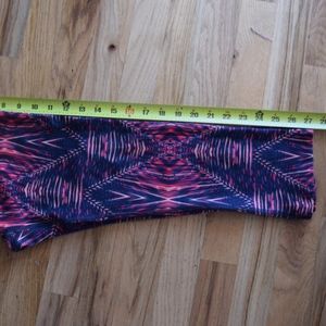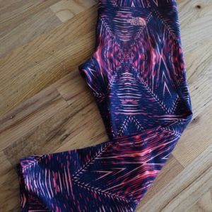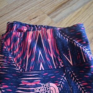 These are North Face Capri's! Excellent condition. They are a 27 length as shown in photo 2, and there is also a small pocket on the inside to hold keys. Tiny bit of pilling on the top but not noticeable. I can barely see it with my naked eye. Please feel free to ask me any questions! :) They are a fun color with a mix of pinks, orange, and navy.
