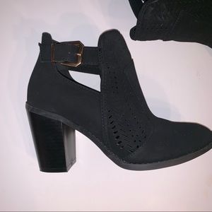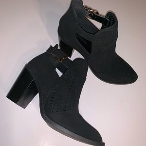 Black ankle booties with metal buckle on the side. These are super cute and were only worn a couple hours. The only reason I am reselling is because I have a wider foot and they are slightly tight for me at end the end of my foot. Other than that, they are comfortable.