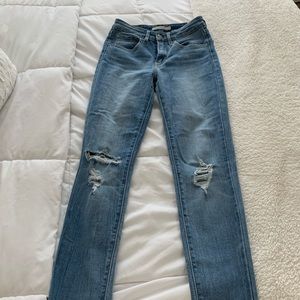 Light wash distressed skinny jeans from Levi’s size 24 style 721 high rise skinny. I am 4’11’’ for reference. Distressing on the knees as seen, medium rise. Very cute and great condition!