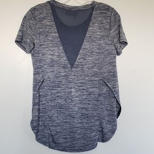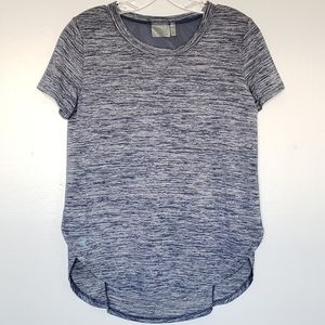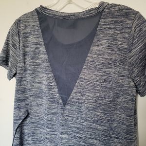 Blue space dye tee with mesh v on back and rounded hems with split sides. EUC