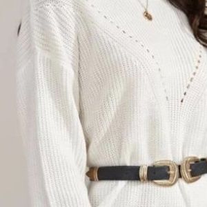 Soft and warm Ivory Long Maxi Sweater Dress Tunic. Round neck. Drop Shoulder long sleeves. Loose fit, belt not included. 100% Acrylic.