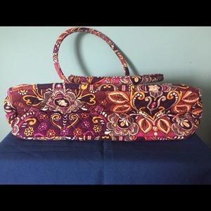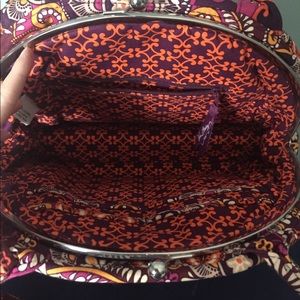 Beautiful Vera Bradley Purse and matching Wristlet. The main colors are plum, fuchsia and gold. Center compartment has kiss lock. Two side compartments. 9 interior pockets . The Wristlet has one interior pocket. Comes from smoke free home . Pre owned but excellent condition.
