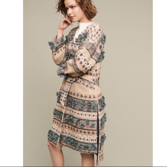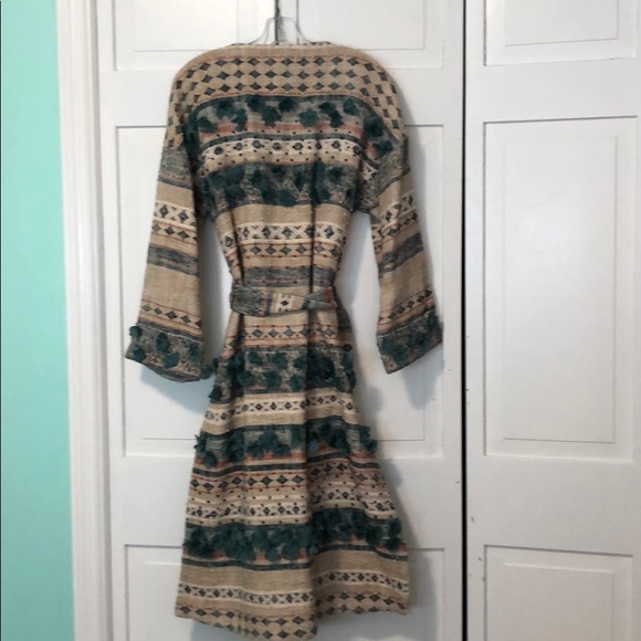 “Textured Tassel Coat” by Tryb, a city to seaside collection designed by friends Jeffrey Cayer & Somali Singh, made for those with bohemian hearts & metropolitan minds; beautiful tweed in beiges, blues & kind of a burnt orange pinkish color with blue tasseled fringe detail, side pockets, tie closure; length measuring approx 44” in front & 46” in back, relaxed fit so cannot exactly measure shoulders & arms; fits like a 4 or a more relaxed fit for a 2