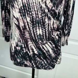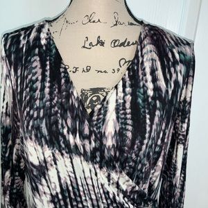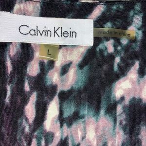 CALVIN KLEIN TOP. Wrap Style that drapes beautifully. Soft knit. Colors of Blk/Teal/Purple and cream. Tye Dye feel. Excellent Condition.