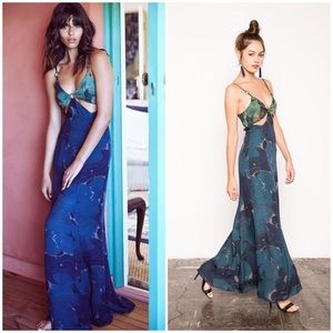 Insanely beautiful Delius gown in mixed lily silk, a hand drawn green lily / blue lily silk unique to Stone Cold Fox. Brass hardware, adjustable straps, fully lined. Hidden side zip. Size 2 = US 6, measurements are 36-28-38. If you wear a small, this is easy to tailor smaller ✨
