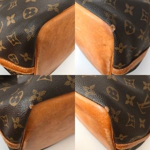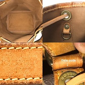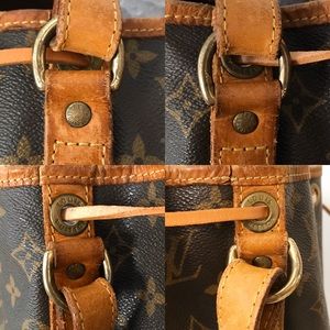 100% authentic Louis Vuitton Petite Noe drawstring bag. Vintage, H10.5 x L9.4 x D7.1in, adjustable shoulder strap with notches, date code/made in France stamp unreadable, very faded (see photos). Monogram canvas has wear on bottom corners, drawstring closure non original LV. Tan vachetta leather trim/strap have dirt spots, creases, discoloration, scuffs, cracks. Hardware has fading and scratches. Interior has minor dirt marks with normal signs of use. Retail price $1290 before tax. NO TRADES
