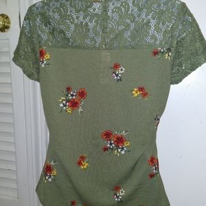 NWT No Boundaries green lacey floral top. Beautiful green colored top with red, yellow and white flowers. Great to dress up or dress down. Dog 🐕 friendly home! Measurements Length 24"; pit to pit 16.5;"; shoulder to shoulder 14.75"; These measurements are taken on a flat surface by me. They are as close as possible, may not be exact.