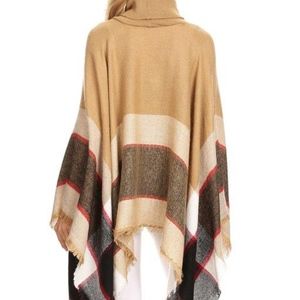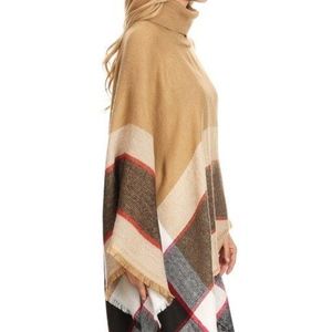 Plaid/knit, long body poncho in a pullover style with a turtleneck and an asymmetric hem