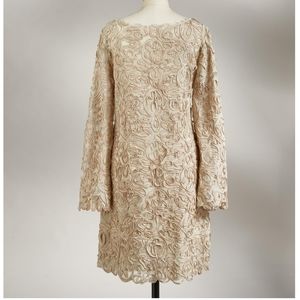 Gorgeous champagne colored dress with beautiful details/patterns throughout dress! Subtle bell sleeves, pull on style with side zip. Stretchy fabric, slip is missing. Otherwise brand new with tags. Originally $218!!