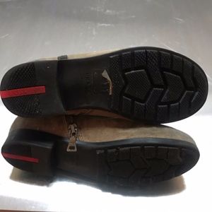 Prada tan suede ankle boots for kids, Prada size 31, in mint, like-new condition (worn only twice). Unique item!! The black rubber sole measures 8.5" (the original material-specifying sticker is still on the right boot). We are the first owner and purchased these in Europe for our child. The inside is marked "0314 31". The color combination is tan/chocolate brown (Prada stripe on exterior of boot, both sides). Full leather dark brown inner lining. The perfect gift! Sold as-is.