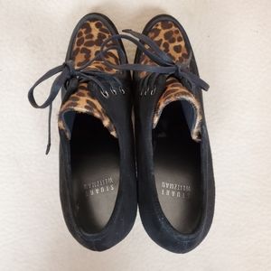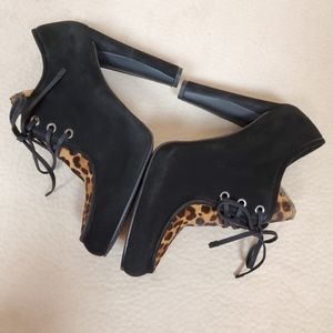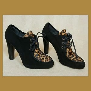 Black velvety nubuck lace-up shoes with cheetah print cowhide on vamp.