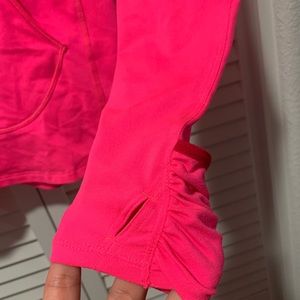 This women’s Nike running jacket is in a BRIGHT hot pink color, you will definitely get seen in this! It’s a really soft material, has front kangaroo pocket and the sleeves have thumb holes and they also have a bit that folds over to cover your fingers, almost like mittens! I tried to get this in the photos, please see all of them. There is a slight bit of pilling above the kangaroo pocket, not really noticeable. Still in good used condition.