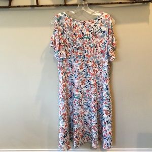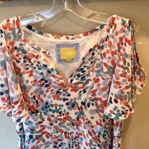 Fantastic details in this dress by Maeve for Anthropologie.... beautiful feel to fabric, lined, split neckline with tucks for shaping and ease. Empire waist, A-line skirt, flounce sleeves with a split sleeve.