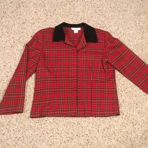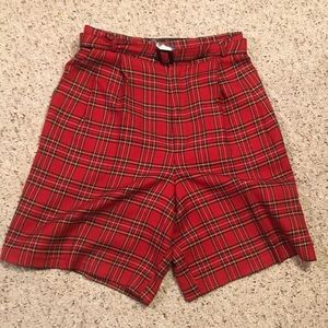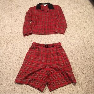 Fabulous vintage red tartan plaid 2 piece set. Top or jacket and high waist shorts with matching belt. Wear as separates or together with top tucked in or open as a jacket. Either way you’ll look festive this Christmas season and I doubt anyone else will be wearing the same outfit. Add black fish nets and booties for an edgy runway look or classy with pumps.