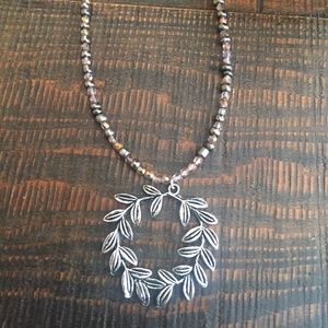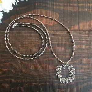 This long necklace is perfect for layering or wearing alone. The wreath pendant is perfect for fall and the brown, bronze and gold accent colors are gorgeous! Measures 35 inches.