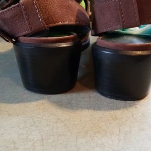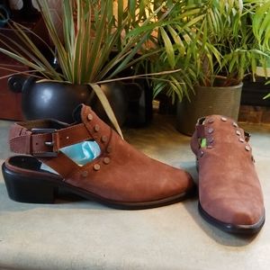 Cocoa brown w/ dull bronze studs. Cowboy boot front ~square toes. Leather outside and insole. Made in Brazil. Worn once. Sadly too narrow for me...Fabulous shoes if I do say so myself !