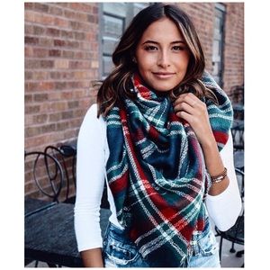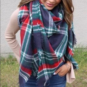 Navy, red and green holiday plaid printed blanket scarf with frayed hem.