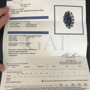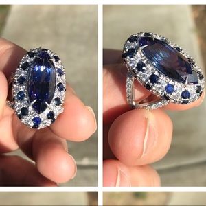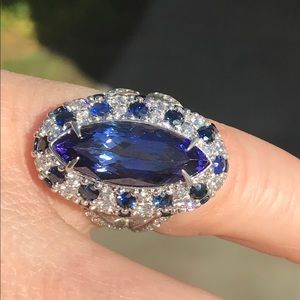 Beautiful Tanzanite, Diamond, and Sapphire solid 14 karat white gold ring. The tanzanite is 8.69 carats, natural bluish violet marquis brilliant cut stone. Its absolutely stunning! The diamonds are 1.55 carats VS F-G color, and the Sapphires are a gorgeous blue. Sapphire ctw is 1.92. The total carat weight is 12.16. The appraisal value is $17,600. The tanzanite has a GIA report . Estate piece, In very gently used condition. . This is a one of a kind!. Tanzanite is Unheated/ untreated 💫🤩❤️💃