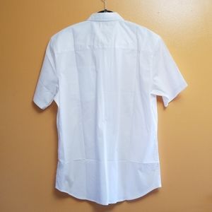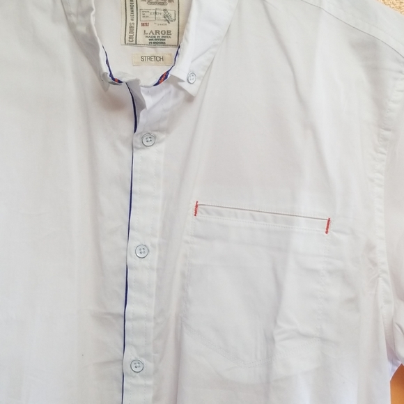 Brilliant white - short-sleeve button-up with contrast royal blue piping down the front. Inside the collar there is also contrast blue and orange as well as orange accent stitching on the corners of the pocket!