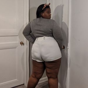 Ivory colored shorts with silver design ovals around waistband. Worn once. (For the pictures shown above.) They're a size 3x, but they fit likes 2x.