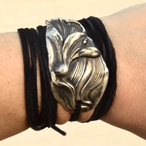 Art Nouveau Floral Sterling Leather Cuff Wrap Tie