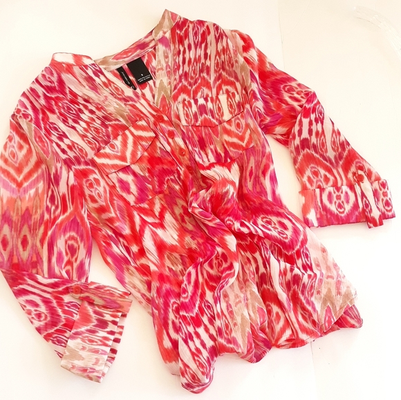 New directions ladies sheer tunic top size small in Magenta,Coral,White and Tan. 100% Polyester pull over has four buttons 2 front pockets with flaps and 3/4 cuffed roll sleeves. Stylish v neck PreOwned