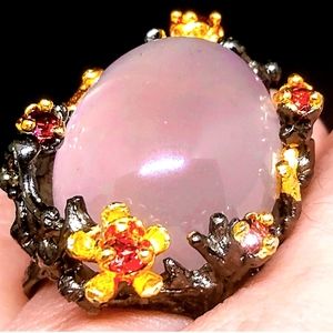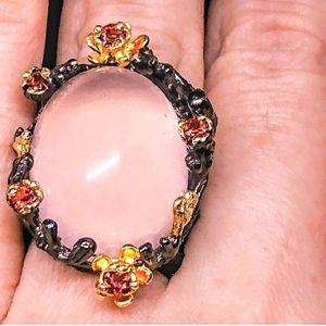 An amazing and ethereal ring with 30 carats of blush pink Rose Quartz. The accent stones are Spessartite garnet.