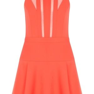 This is a NWT sassy BCBG MAXAZRIA "Tatyanna" Mesh-blocked Halter Dress. The bodice is fully lined with finished seams and the skirt is single thickness for some fun and flirty movement. The color is Bright Poppy which is a festive red/orange. Put a cute jacket on this dress for work and take it off to go to dinner or an evening or holiday party in a flash.