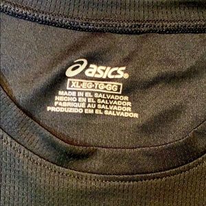 Lightweight, breathable, all black men’s running shirt in XL. Made of 100% Polyester. Measures approximately 19” shoulder to shoulder, 22” armpit to armpit, 24” neck to bottom on front, 26” neck to bottom on back. Short sleeves with “ASICS” on side of one sleeve. Previously loved only a few times, see pictures.